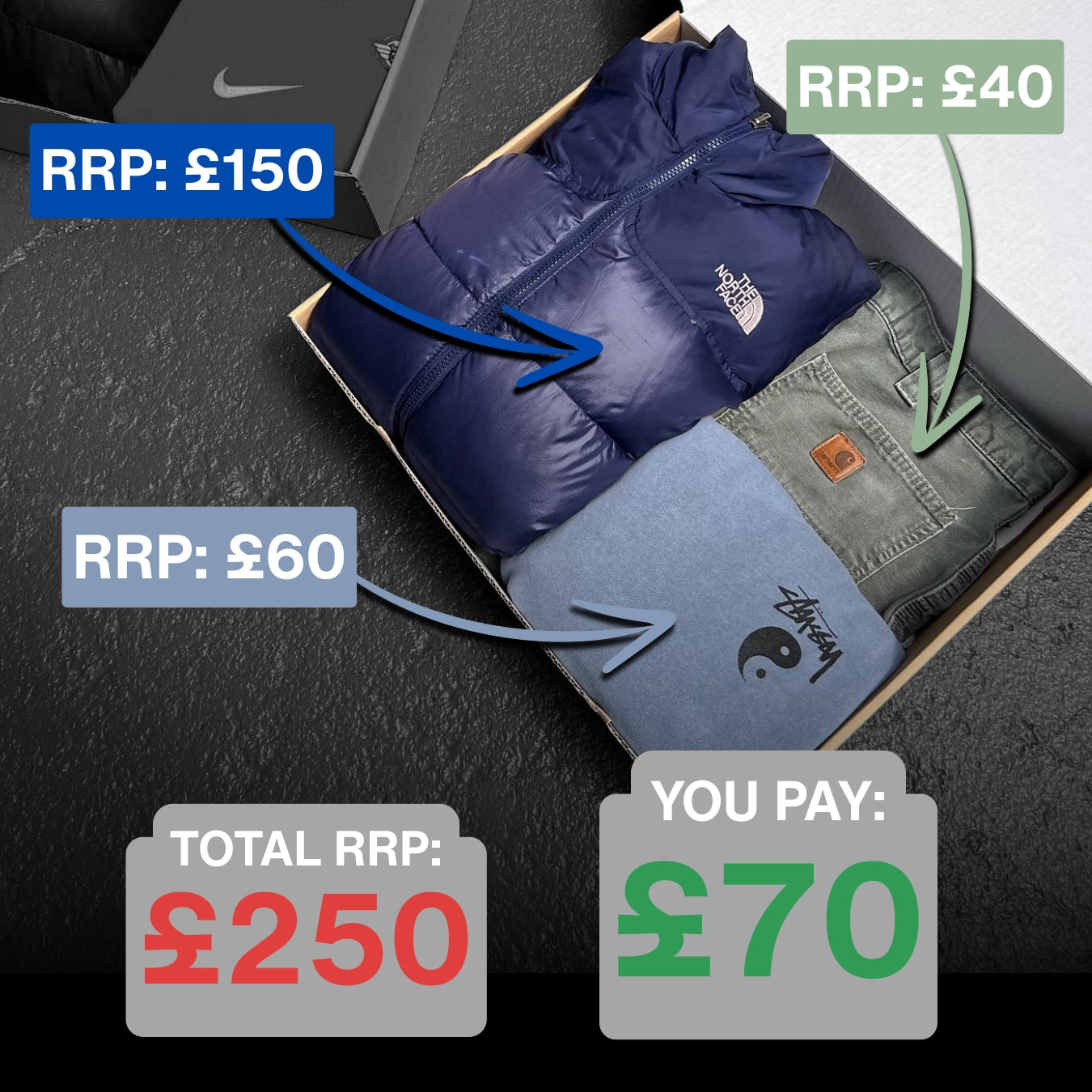 Each box contains a curated assortment of various vintage pieces from the 80’s, 90’s and 00’s. Sportswear, workwear, designer and loads more. Just pick your sizes and we’ll do the rest.