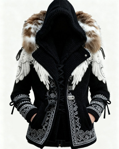 Men's Winter Fashion Nordic Viking Wings 3D Embroidered Knitted Hooded Jacket 9403